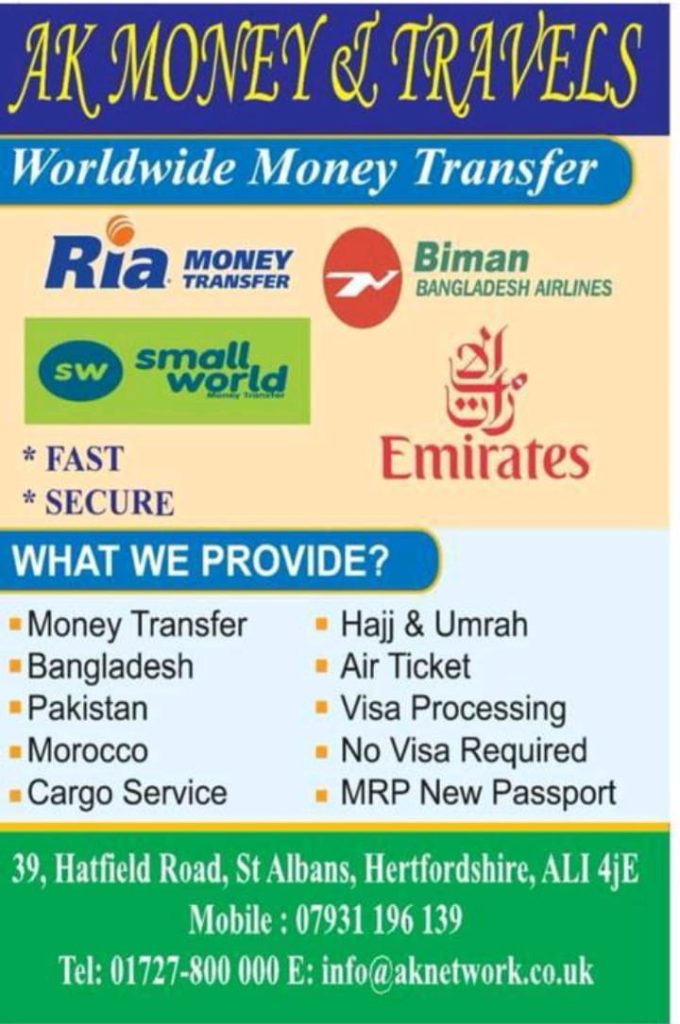 A k Money Transfer Ltd 39 Hatfield Road St Albans, Hertfordshire AL1 4je Tel 01727-800000 Uk